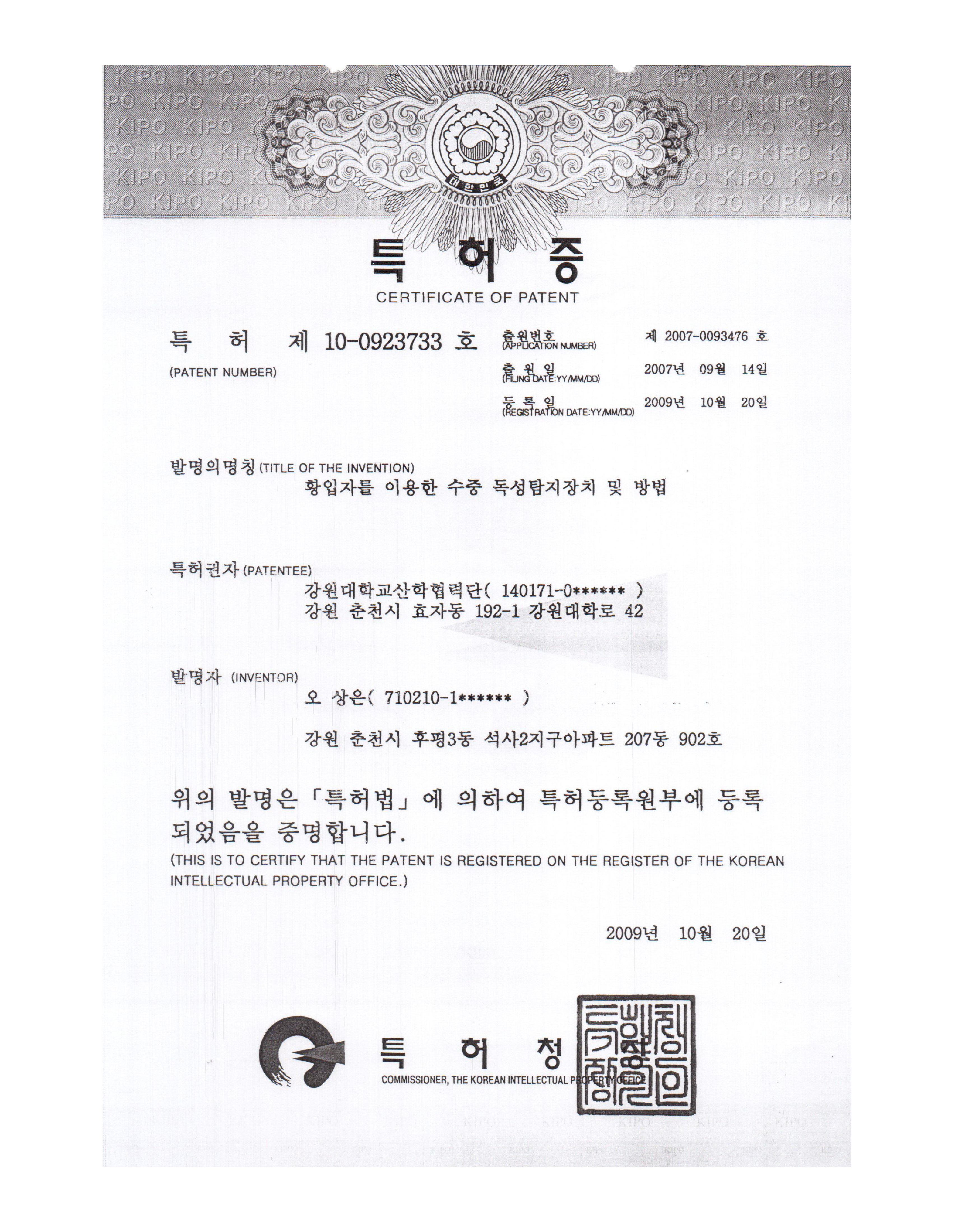Patent No. : 10-0923733