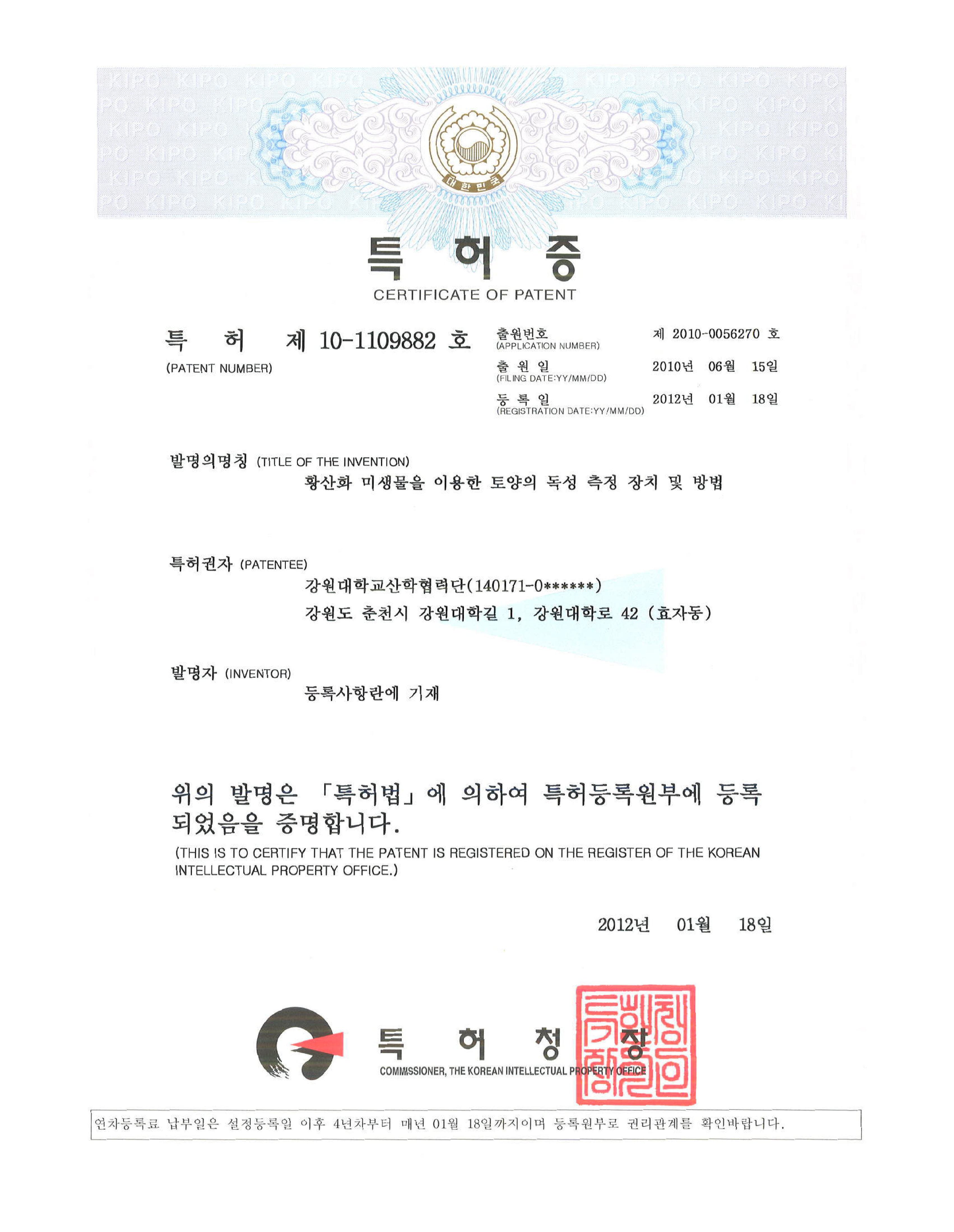 Patent No. : 10-1109882