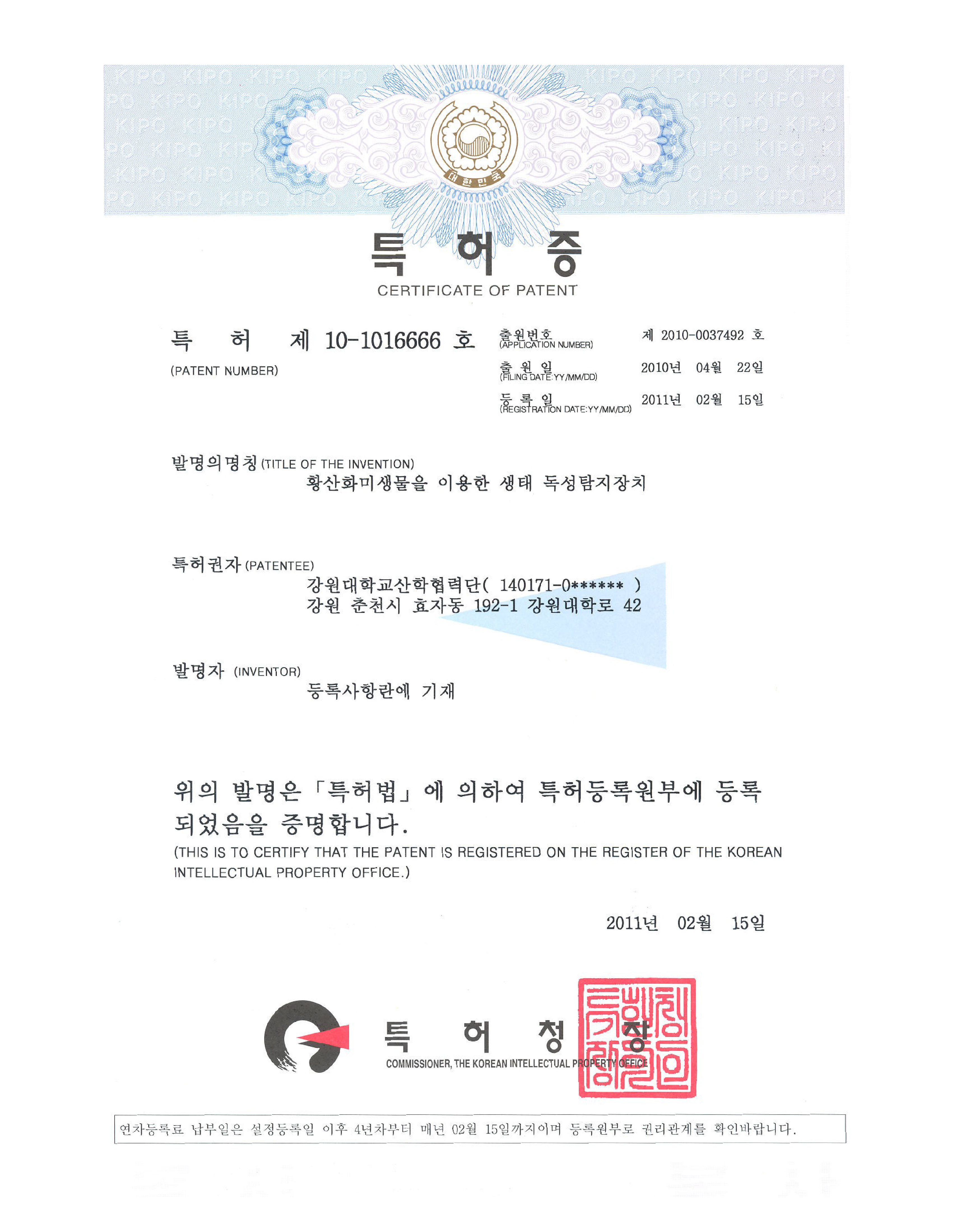 Patent No. : 10-1016666