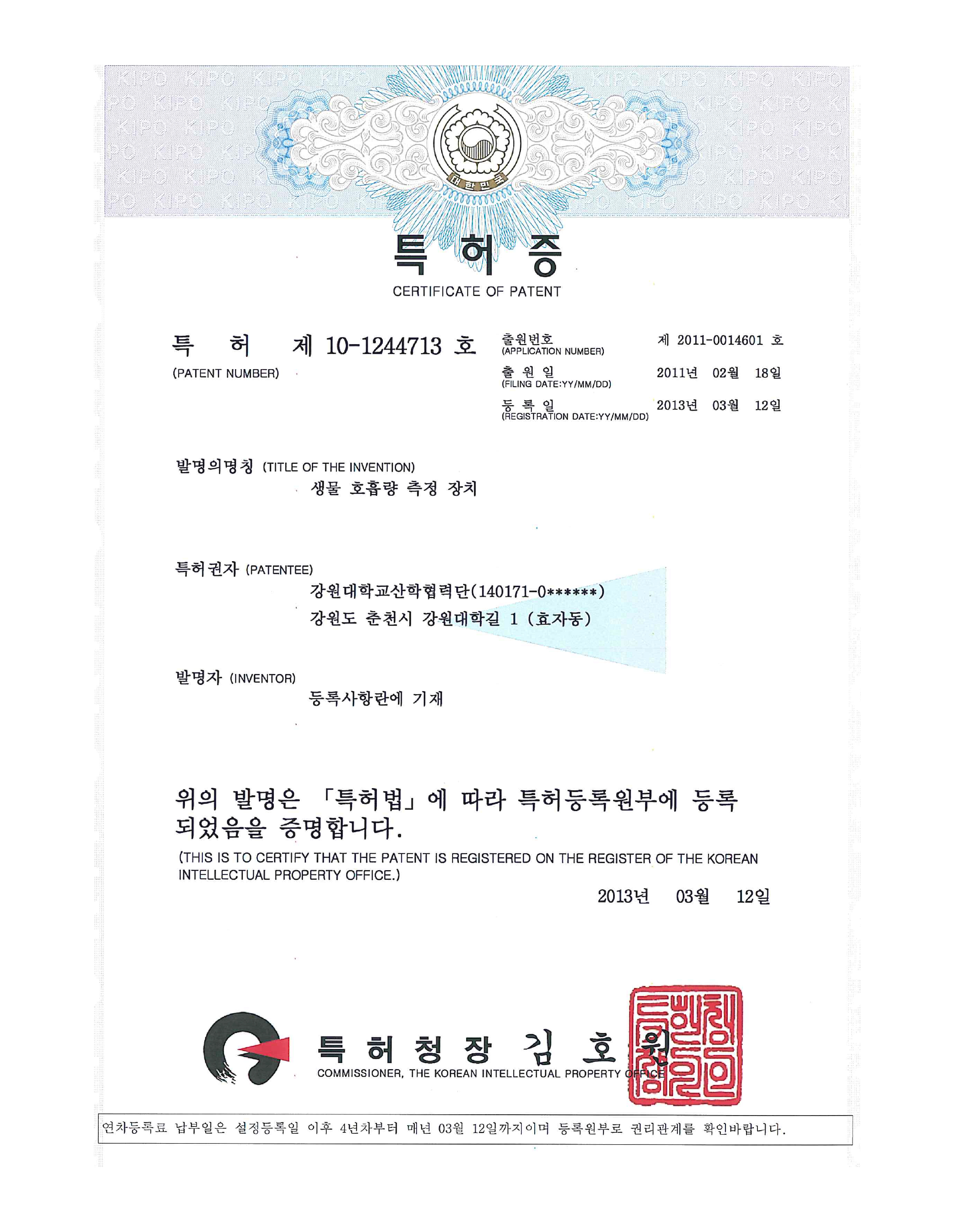 Patent No. : 10-1244713