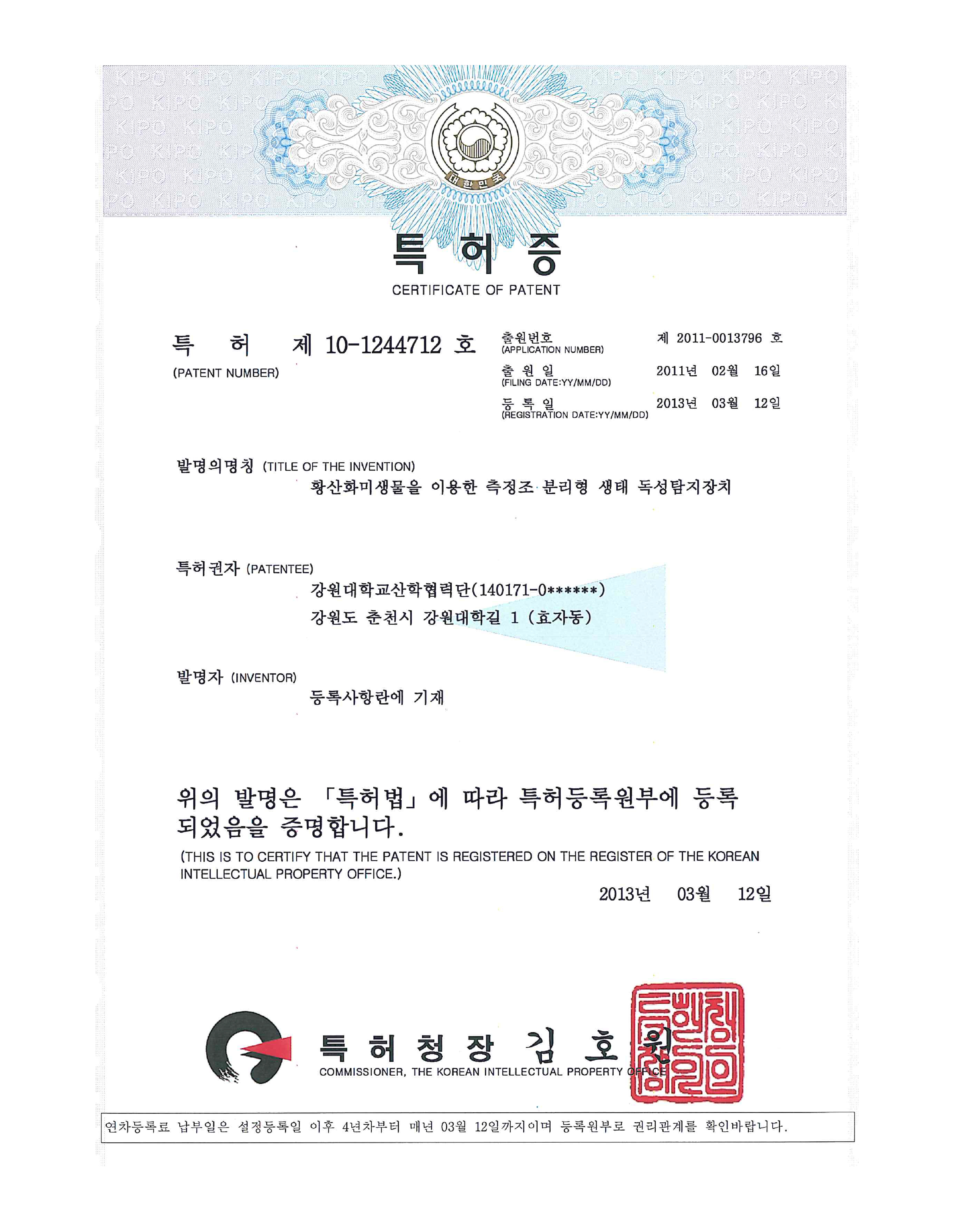 Patent No. : 10-1244712